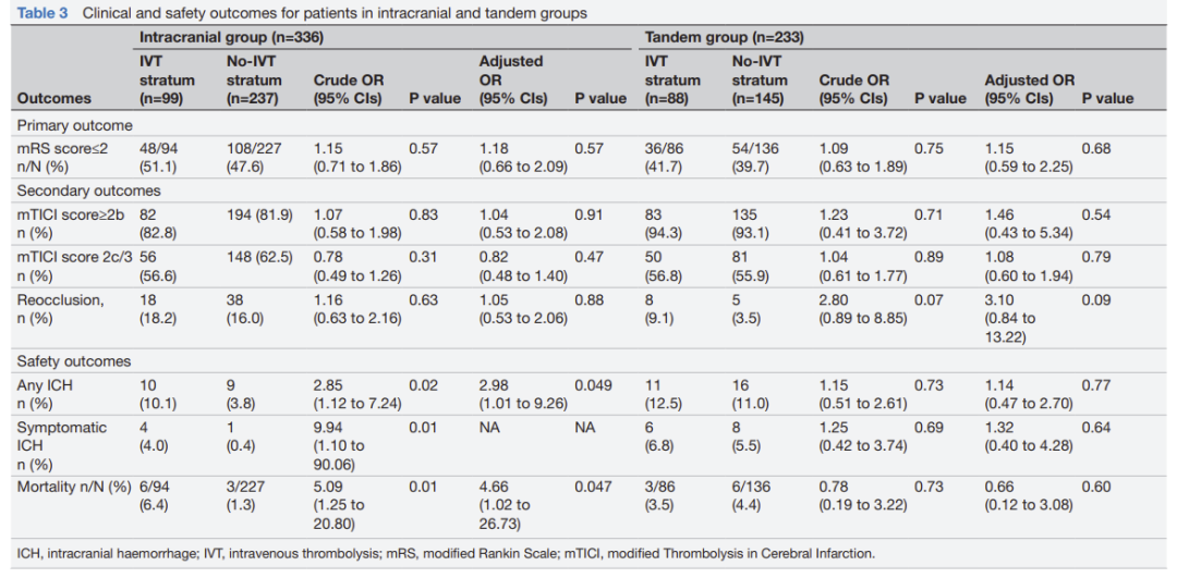 这项多中心注册研究将患者分为两组:颅内原位闭塞组(336人)和颈动脉狭窄/闭塞导致的串联病变组(233人)。令人震惊的发现是:在颅内原位闭塞组中,接受静脉溶栓的99名患者虽然血管再通率与未溶栓组相当,但脑出血发生率却从3.8%跃升至10.1%(aOR=2.98),更触目惊心的是90天死亡率从1.3%暴涨到6.4%(aOR=4.66)。而串联病变组患者则相对安全,无论是否接受静脉溶栓,预后和并发症均无显著差异。这种"冰火两重天"的结果提示我们——不同类型的血管闭塞,需要完全不同的急救策略。