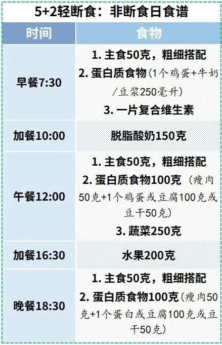 对我们大多数普通人来说,主要是想通过调整饮食习惯来达到改善健康的目的。北京协和医院临床营养科主任医师陈伟曾发文给出了“5+2轻断食”的具体食谱,一周7天,5天正常吃饭,非连续的2天的轻断食,平均一个月减5斤。